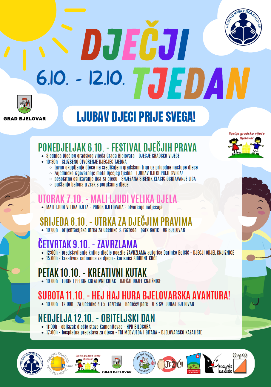Dječji tjedan u Bjelovaru održava se od 6. do 12. listopada pod geslom “Ljubav djeci prije svega!”. Donosimo dnevni raspored aktivnosti.